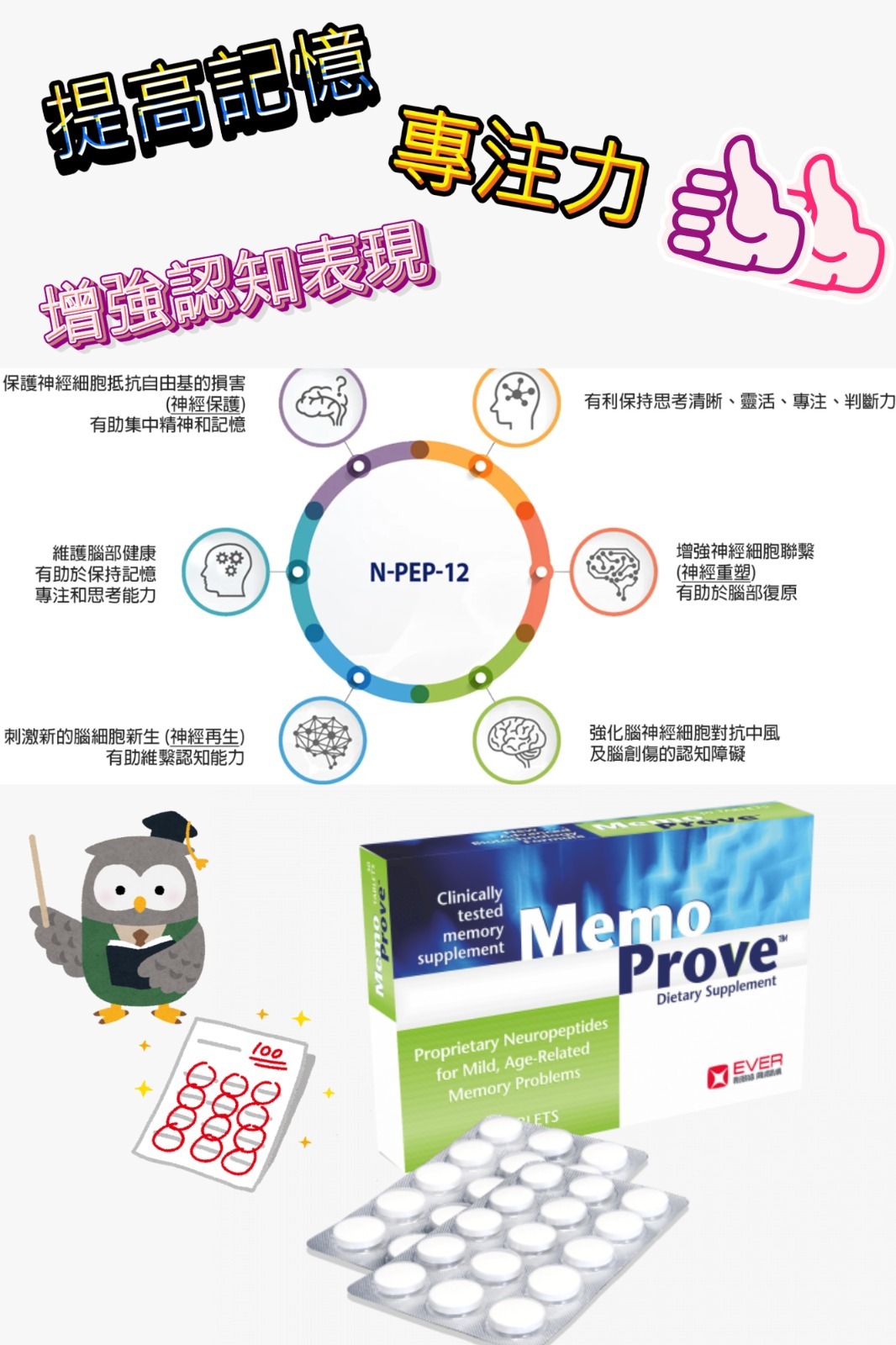 憶活素 MEMOPROVE® 是由奧地利 EVER PHARMA 自家研究與開發的專利配方(N-PEP-12),旨在增強記憶力、專注力與認知能力,幫助提升競爭力。適合希望改善記憶和專注力的使用者,並維持健康生活方式。